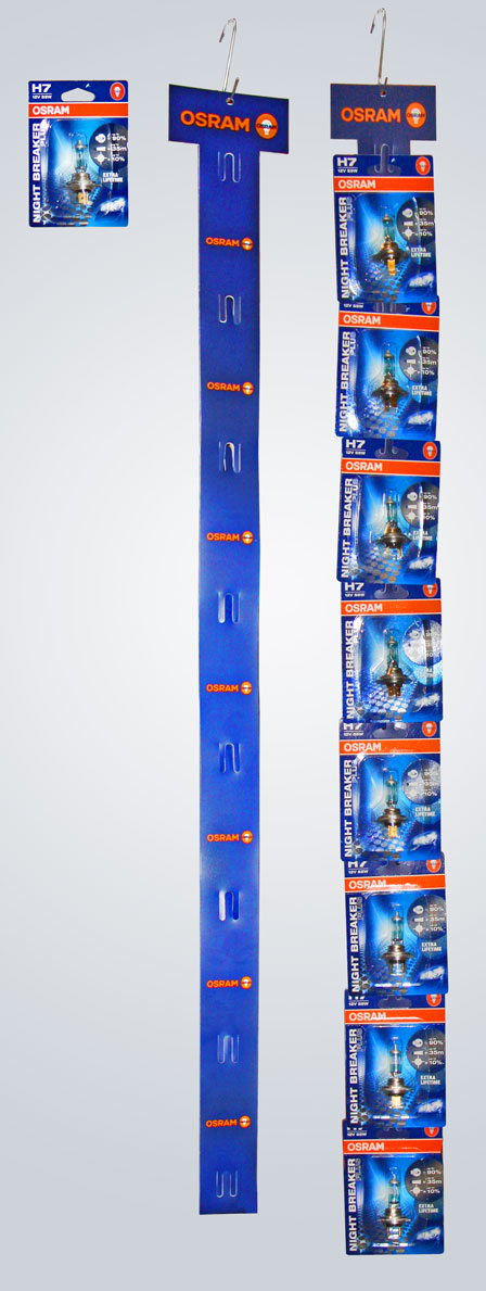 Теперь вы можете приобрести лампы OSRAM Night Breaker в комплекте со специальным оборудованием для их представления на витрине.В такой комплект входят 8 шт ламп и пластиковая линейка с крючками. Цена комплекта в пересчете за одну лампу — заметно ниже, нежели купить 8 ламп раздельно. |