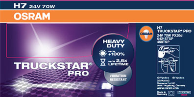 Уважаемые покупатели! Предлагаем Вашему вниманию новинку: OSRAM TRUCKSTAR PRO Лампы для профессионалов, умеющих распознать свою выгоду Преимущества лампы OSRAM TRUCKSTAR PRO: — на 100% увеличенный срок службы* — на 100% больше света* на дороге — на 40 м* световой конус — высокая вибростойкость с технологией Heavy Puty — полностью сертифицированы — уменьшенные затраты из-за снижения уровня отказов (простоя) — широкий ассортимент :H1, H3, H4, H7, H11, R5W, R10W, P21W, PY21W, T4W — Новинки: W5W и P21/5W * — По сравнению со стандартными лампами |