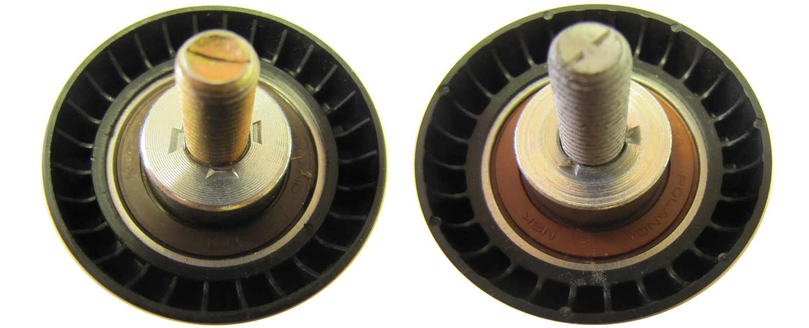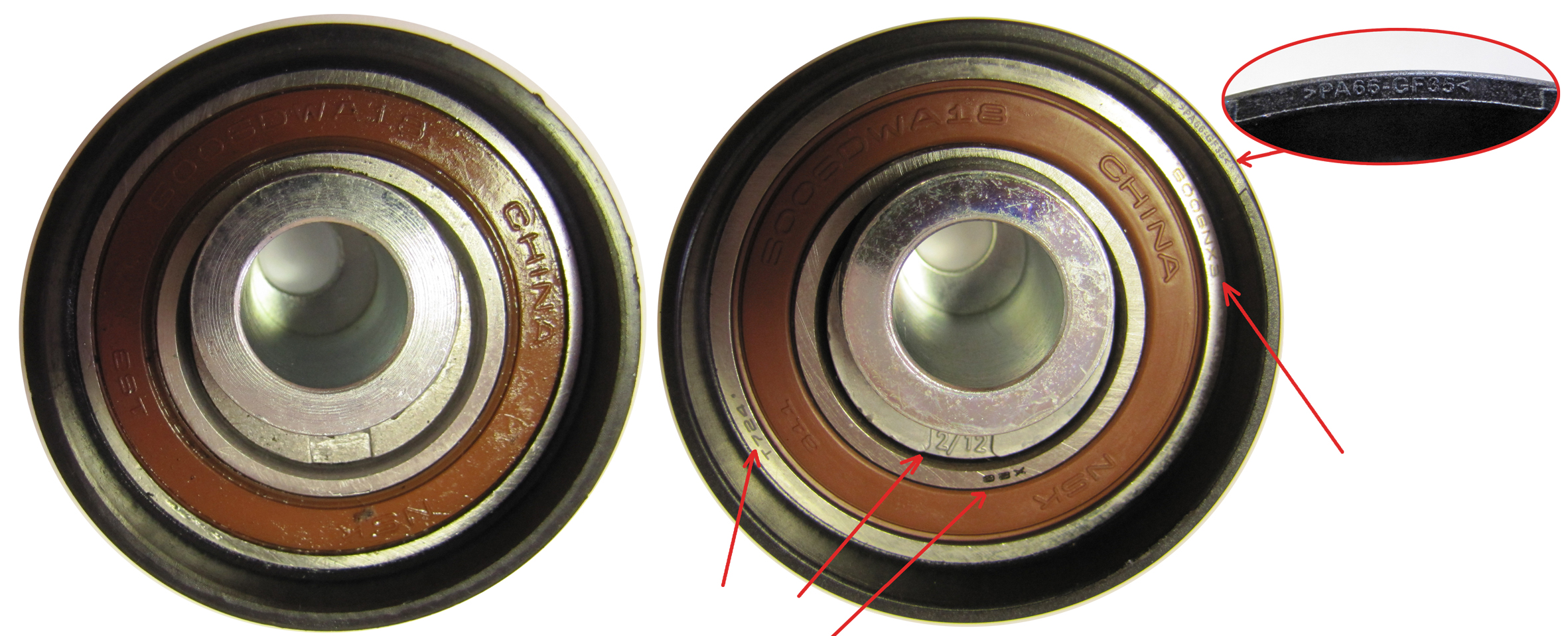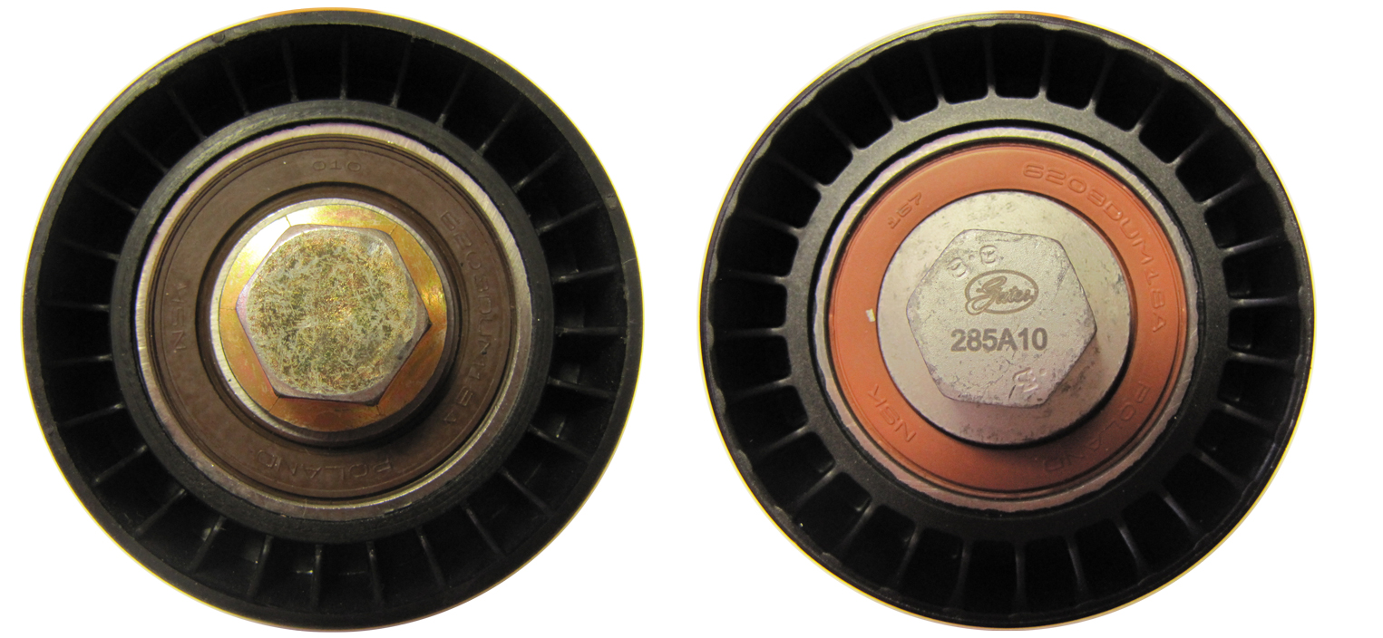На первый взгляд кажется, что ролики слабо различимы. Но при более внимательном рассмотрении оказывается, что на поддельном ролике, в отличие от Gates, недобросовестный производитель не стал заморачиваться нанесением гравировки на металлические детали ролика и маркировкой пластикового края.