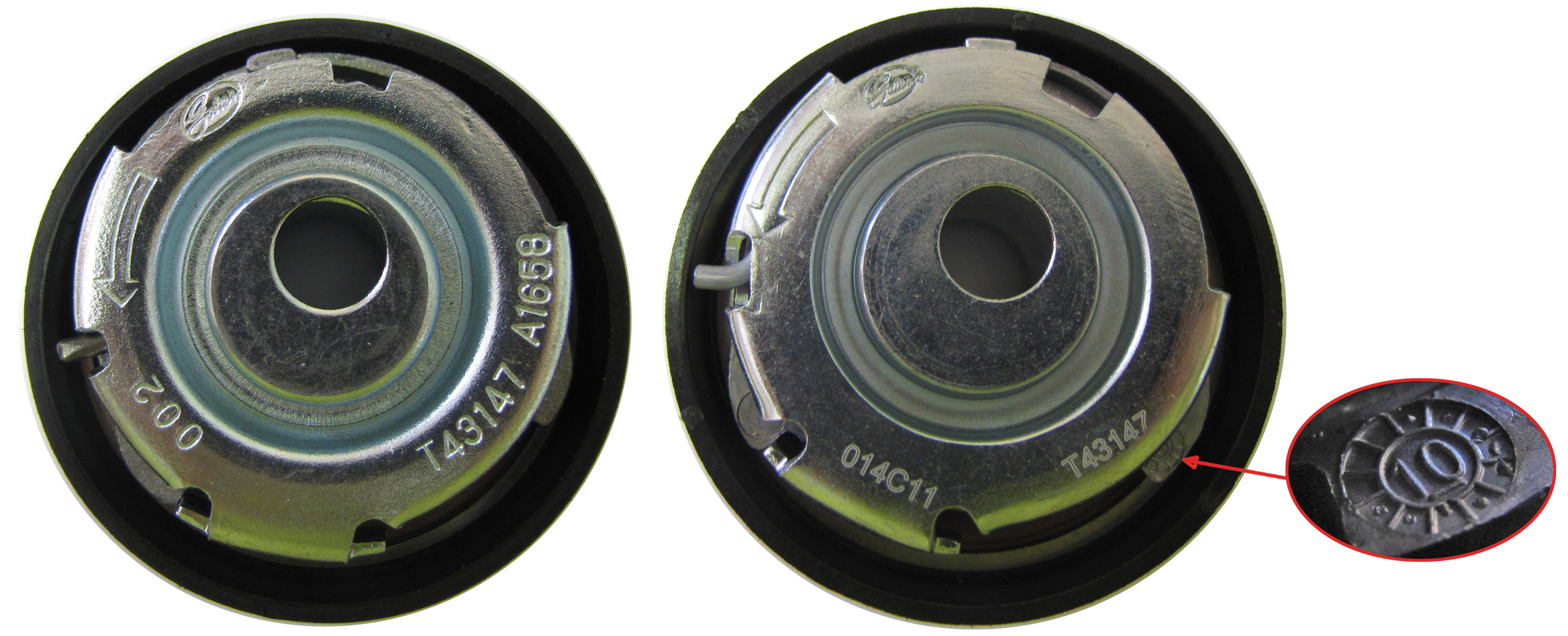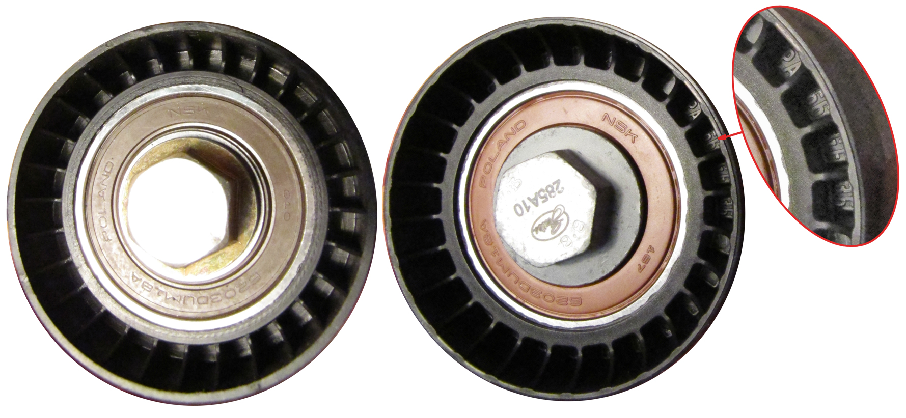 А при более внимательном рассмотрении можно увидеть маркировку и на пластиковой детали настоящего ролика Gates (фото справа). У контрафактного же ролика - всё чисто и гладко (фото слева). |