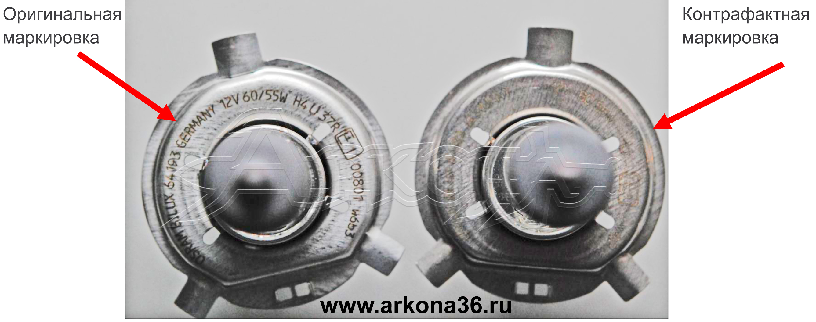 У контрафакта некачественная маркировка, мутная и блеклая — но распознать это рядовой покупатель может лишь при сравнении с оригинальной продукцией. Так что тут, опять же, учитывайте, что при производстве оригинальных галогенных ламп H4 используется лазерная гравировка — не травление, не штамповка, а лазер, результаты которого выглядят четко и аккуратно, буквы в тексте не кривятся и не растекаются.