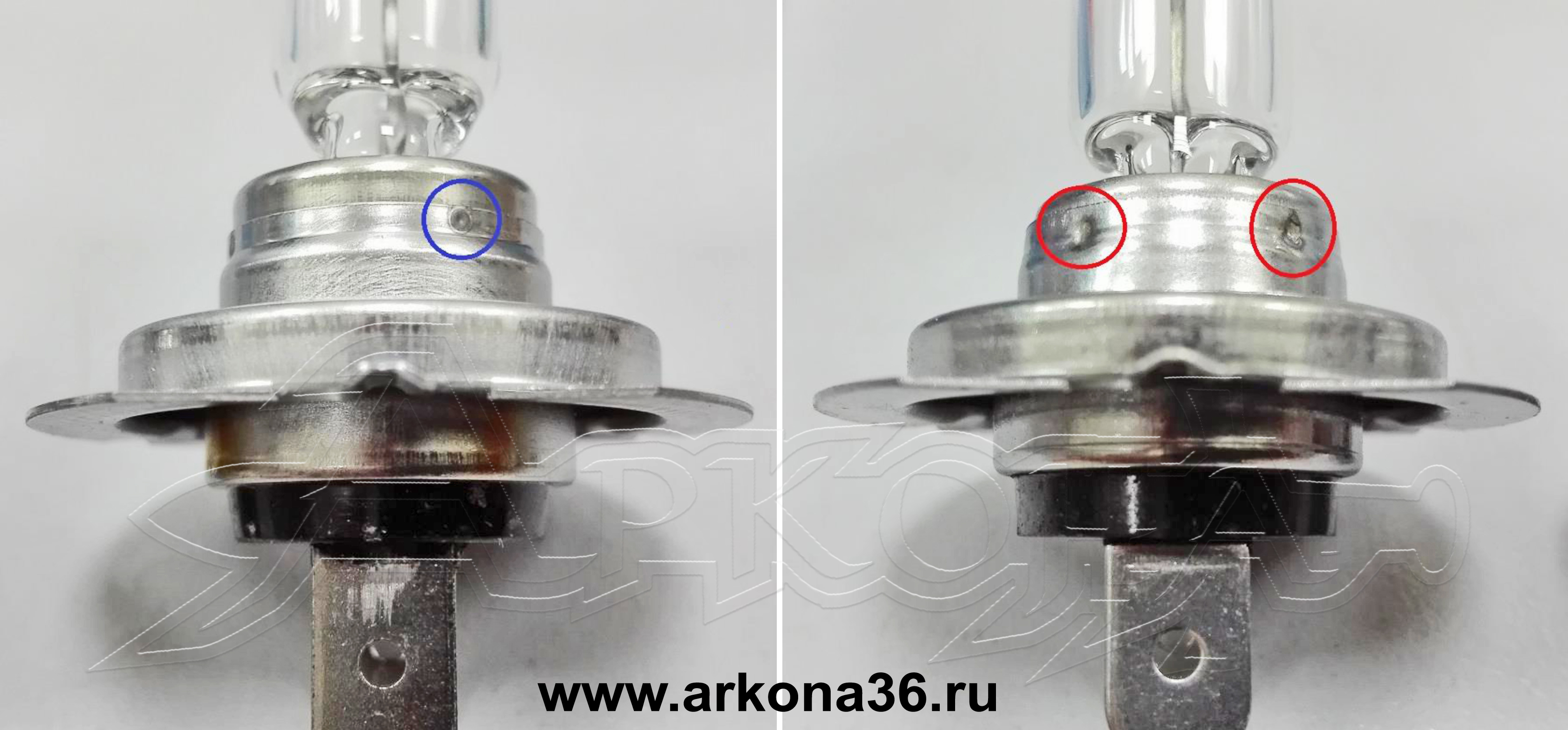 Как уже отмечалось, аккуратный колпачок поддельщикам удается редко — вот и здесь видно, как сильно он поплыл. Есть еще одна важная деталь, в которой прокололись поддельщики, это наличие держателя электродов, которого в оригинальной галогенке H7 нет.