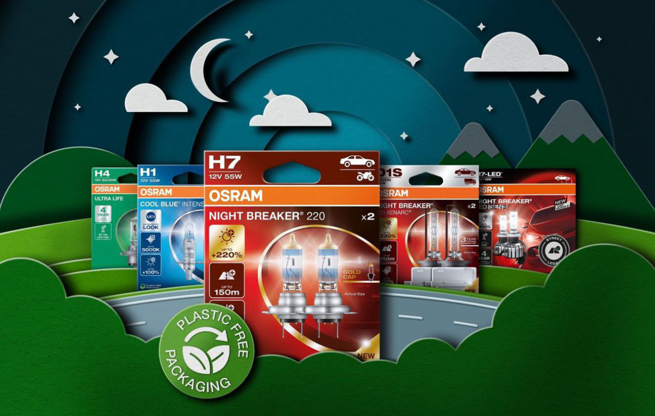 С 2024 года компания OSRAM с пластиковых упаковок постепенно переходит на экологичную. Все лампы OSRAM (светодиодные, галогенные и ксеноновые) будут упаковываться в 100% не содержащие пластик перерабатываемые материалы, изготовленные из возобновляемых ресурсов. Смена будет осуществляться постепенно по мере распродажи склада старой продукции.