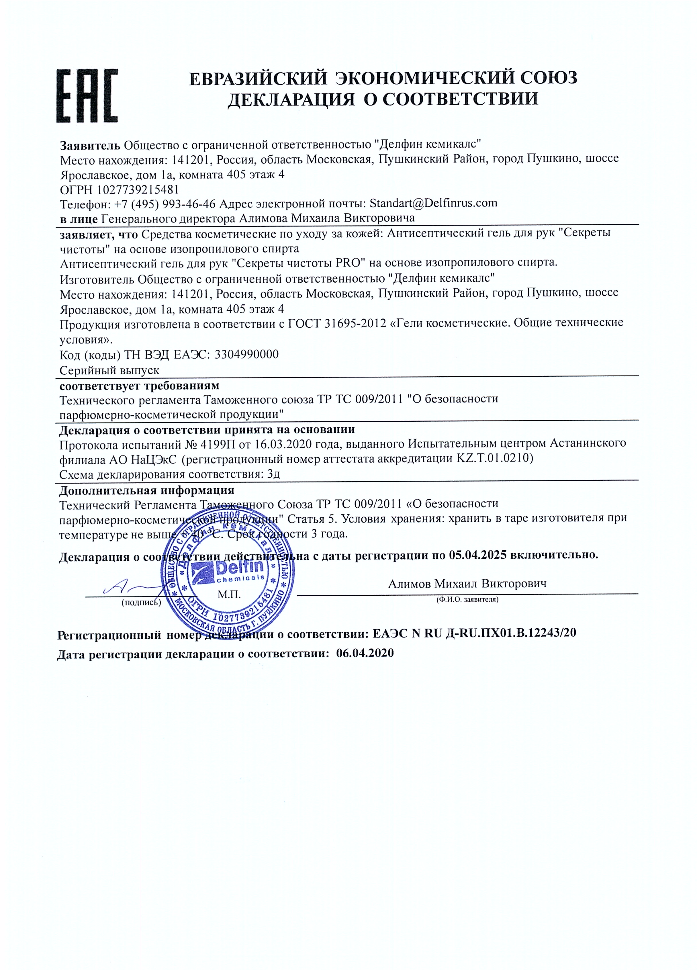 Декларация соответствия "Антисептический гель для рук. Секреты чистоты PRO": скачать (jpg-изображение)