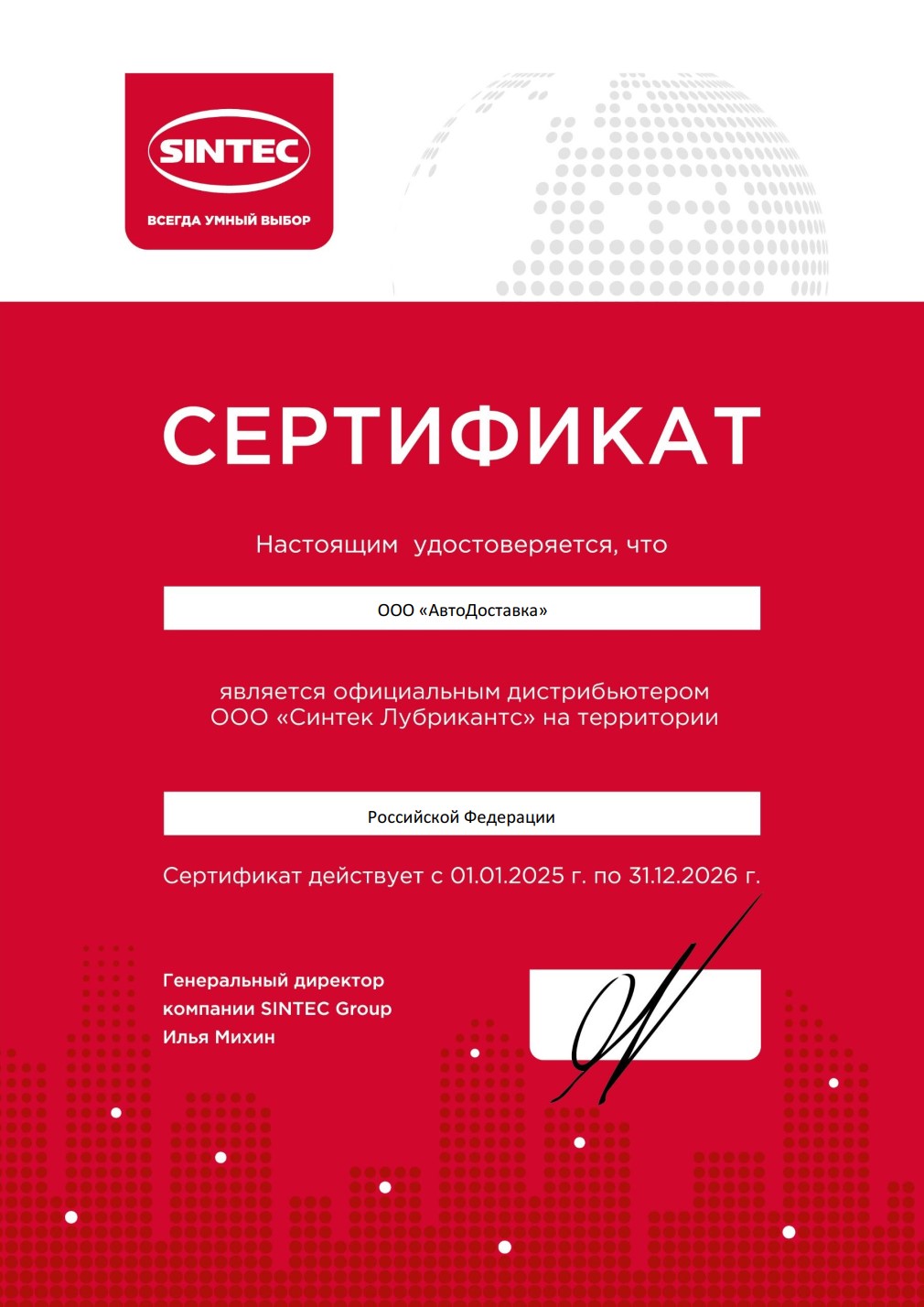 За более чем 20 лет активной деятельности компания SINTEC Lubricants создала обширную дистрибьюторскую сеть из более чем 130 представительств на территории России, Ближнего и Дальнего Зарубежья.