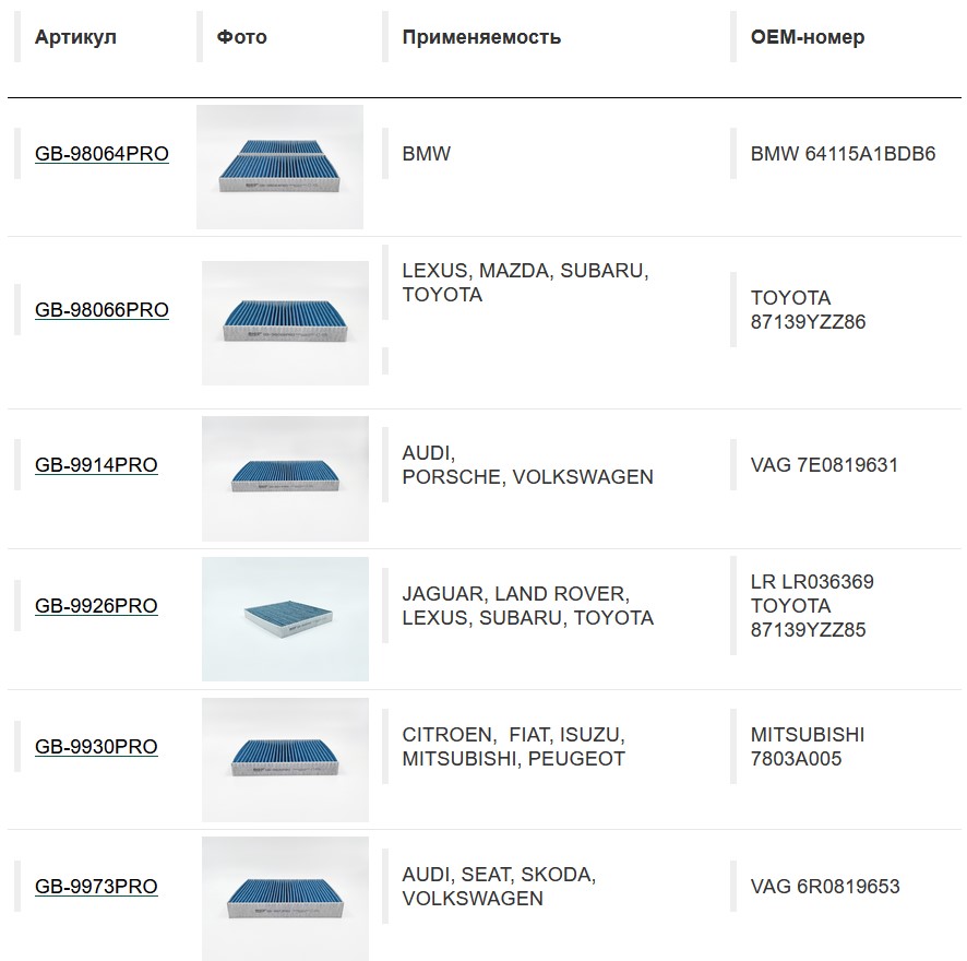 Полная информация о фильтрах (размеры, применяемость, ОЕМ-номера) расположены в карточках товаров в каталоге производителя.